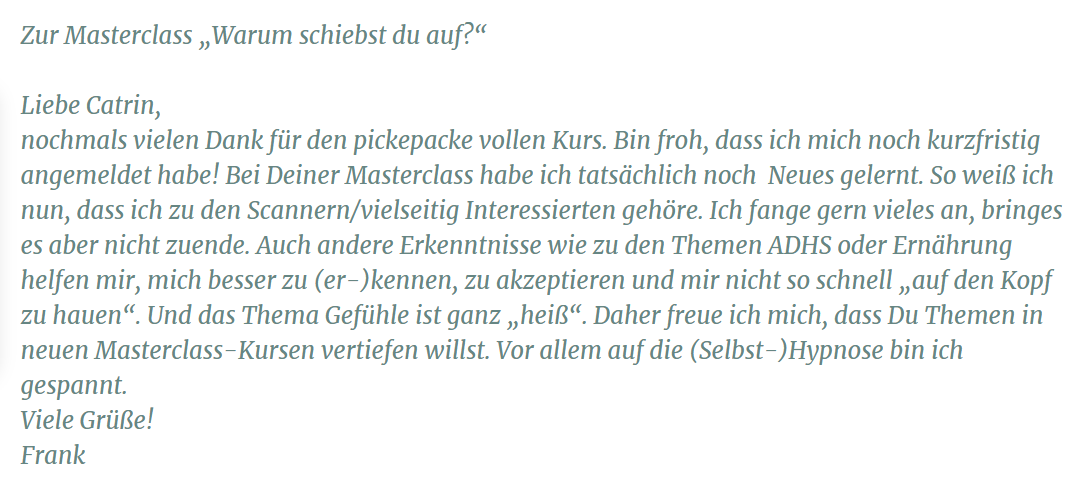 Mir hat die Masterclass geholfen, mir bewusst zu werden in welchen Bereichen ich aufschiebe. Nach der Hypnose bin ich an meinen unterschiedlichen Bereichen ins tun gekommen und hatte dafür die nötige Energie und habe weiter gehört und mir Pausen genommen um an den Fragen zu arbeiten. Auch die Aspekte mit den Gefühlen und den Nährstoffen waren für mich hilfreich.
