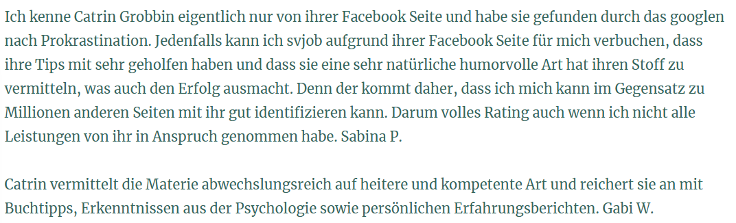 "Meine Aufgabe ist es, Menschen dabei zu unterstützen, weniger aufzuschieben und gleichzeitig entspannter zu leben. Und sich selbst nicht so fertig zu machen, sondern achtsam mit sich selbst und der eigenen Zeit umzugehen, um die eigenen Ziele, Wünsche und Träume zu verwirklichen, ohne auszubrennen."