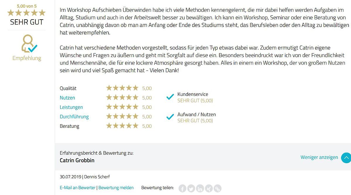 Seit 10 Jahren führe ich erfolgreiche Seminare und Workshops zum Thema "Schluss mit dem Aufschieben" durch.